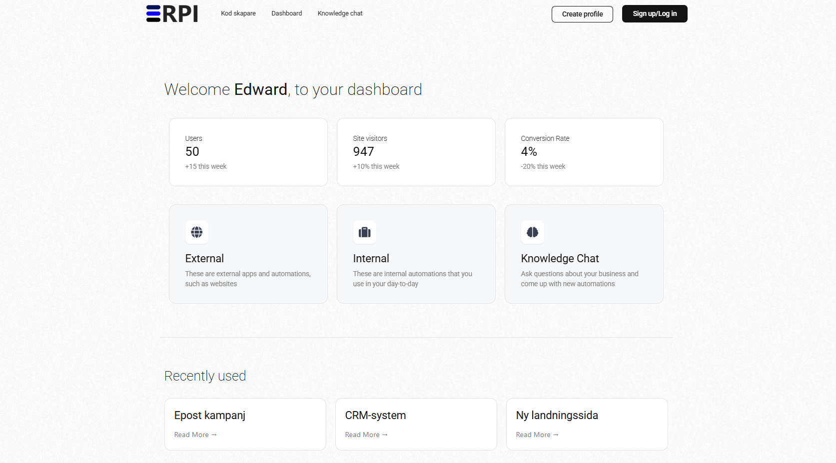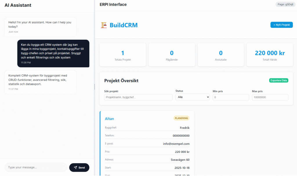 Bygg hemsidor, skapa interna system och analysera data – allt i en enkel, AI-driven chatt. Spara tid, pengar och stress med en central hubb för ditt företag.